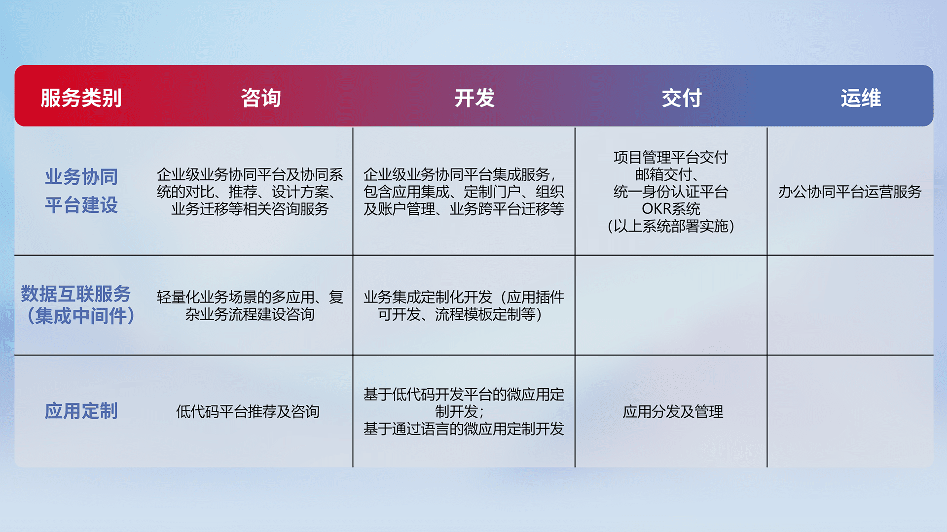 针对钉钉、、企微、、、IDaas等平台级产品提供产品的规划、、方案、、交付、、定制化开发等服务,,实现如统一协同办公、、、、智能客户服务、、、、混合会议管理、、、、智能数据查询、、、等业务场景,,实现数字化转型。。。。