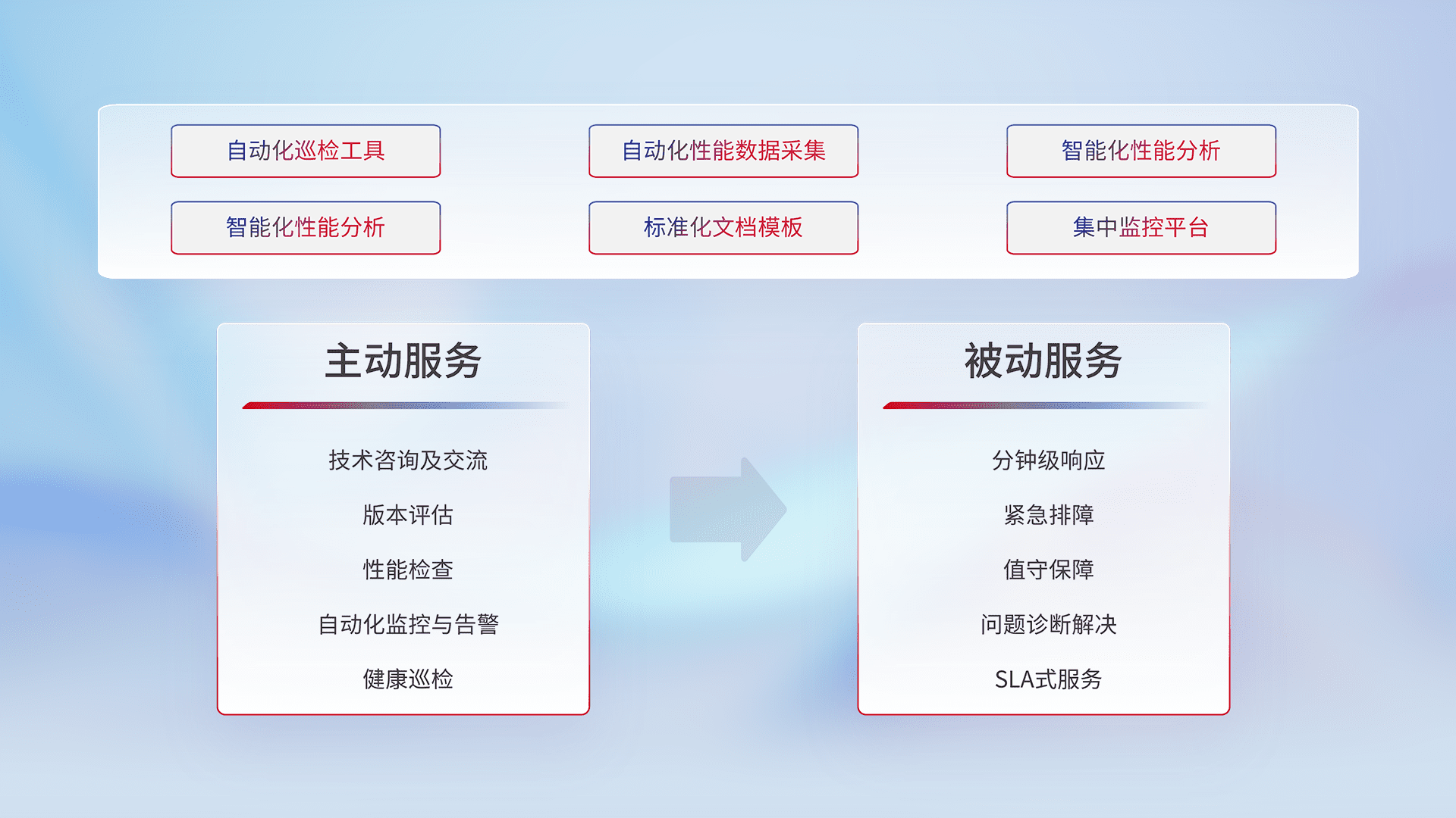 智能化工具和标准化文档,,,保障服务质量,,,,提供主动服务(包含技术咨询、、版本评估、、性能检查、、、自动化监控与告警、、、健康巡检)和被动服务包含(分钟级响应、、、紧急排障、、、值守保障、、问题诊断解决、、SLA服务)。。