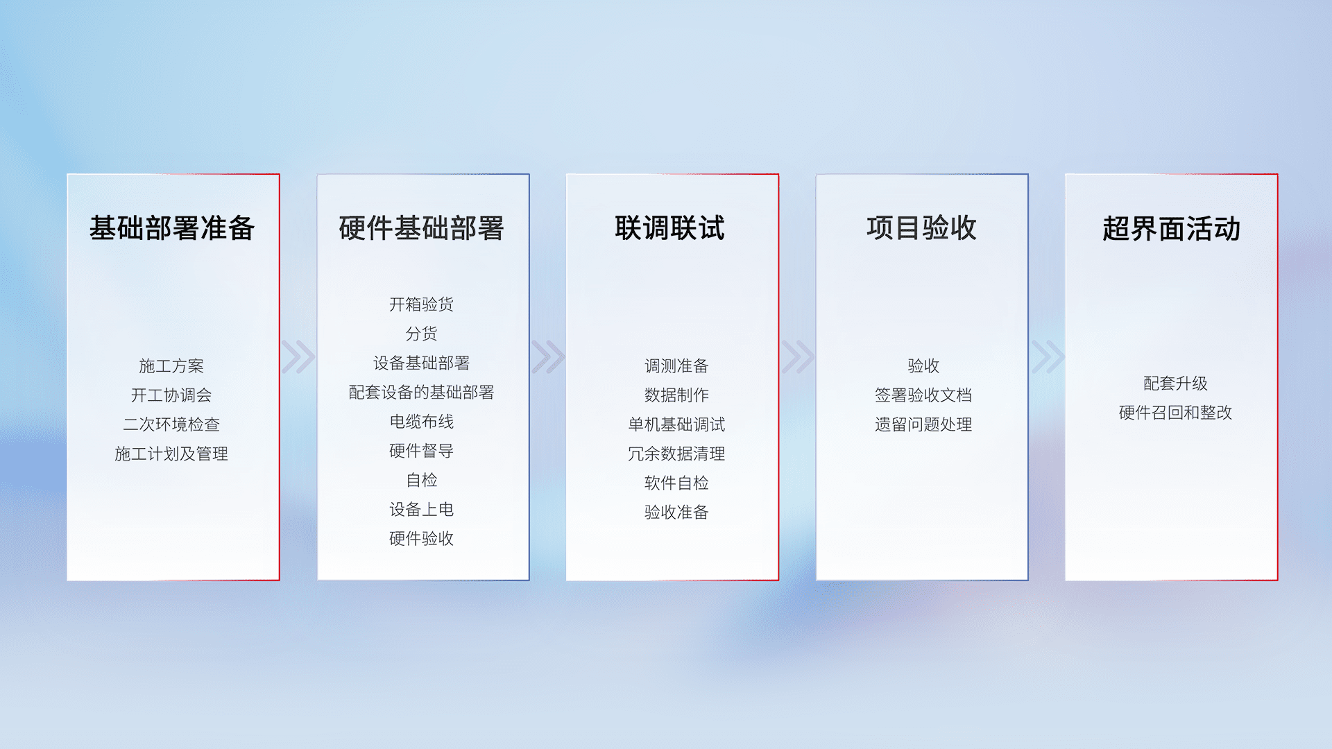 从基础部署准备、、硬件基础部署、、联调联试、、、项目验收、、越界面活动的全过程可追溯,,,,保证施工质量和进度。。。
